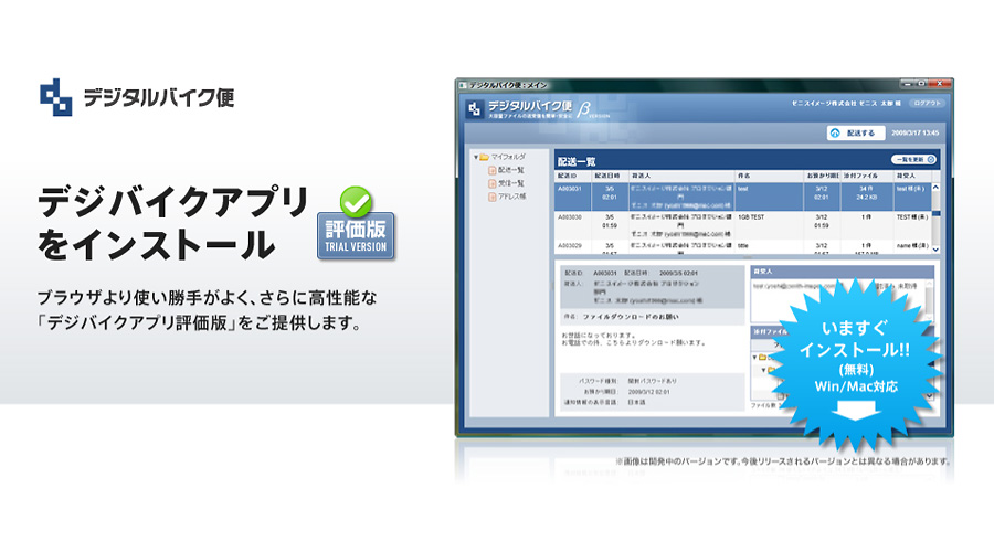 ネット配送サービス デジタルバイク便の新機能「デジバイクアプリ」のデザインをAdobe AIRにて作成。ファイルアップロードはドラッグ&ドロップで操作性がさらに高くなりました。また、アプリケーションを紹介するサイトデザインもおこないました。